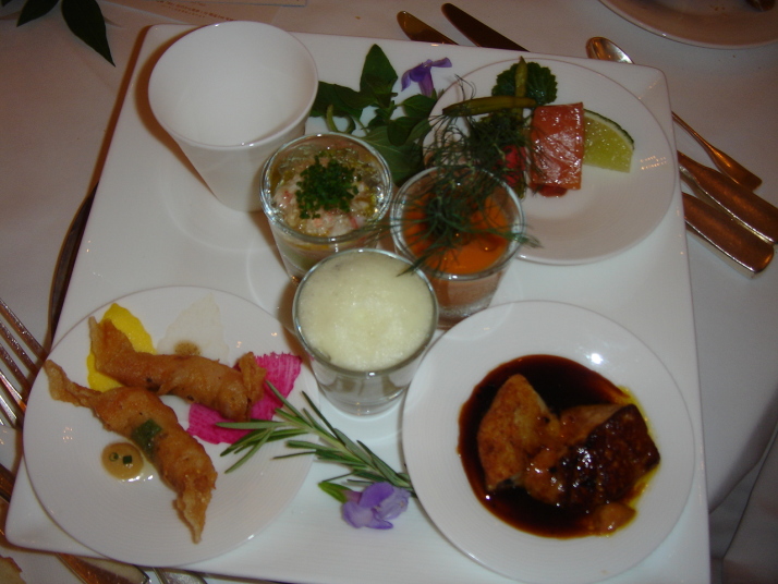さまざまな前菜の取り合わせ ガスパチョ ブルチーニのスープ 甘エビのマリネ ファグラのソテー 海老のブリック包み揚げ 自家製スモークサーモン 蟹のリゾット